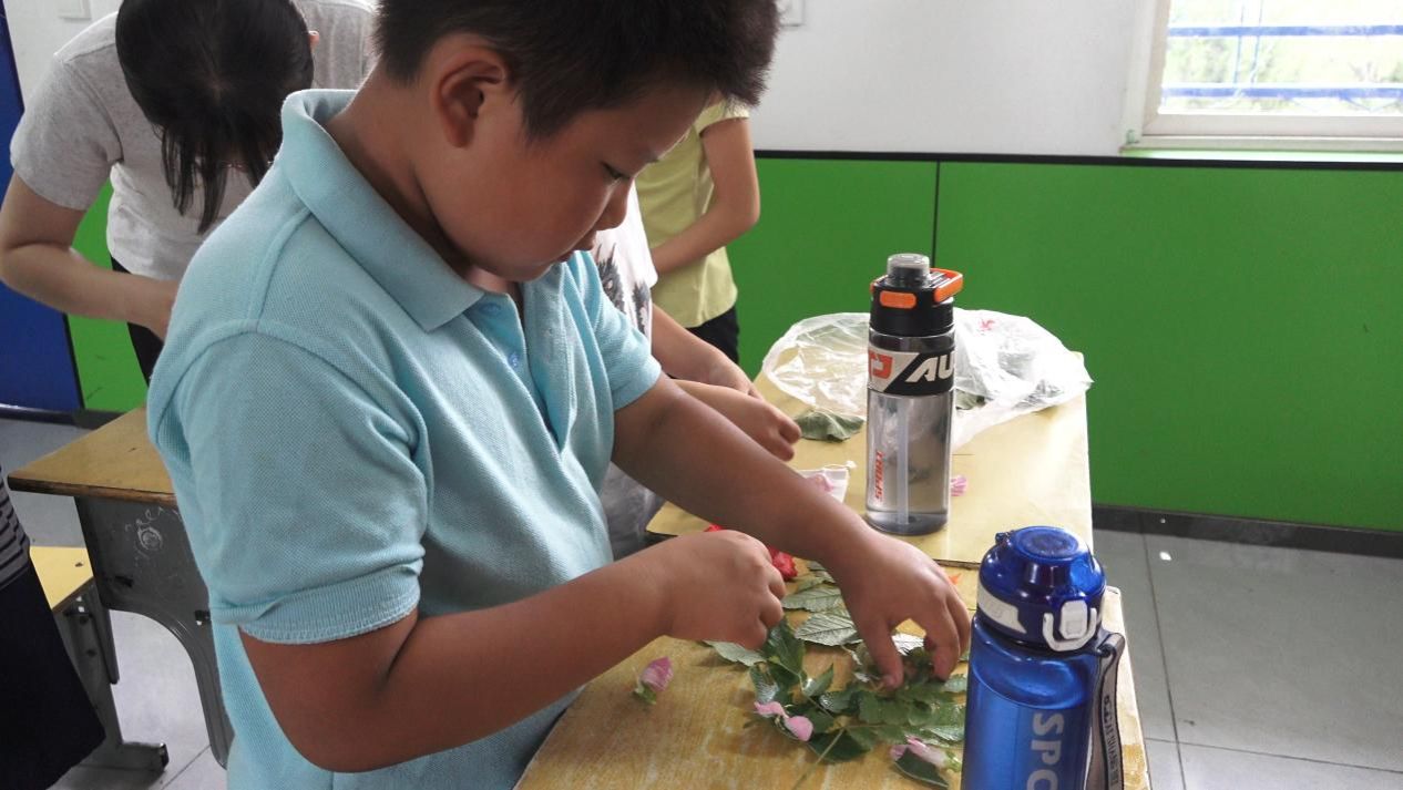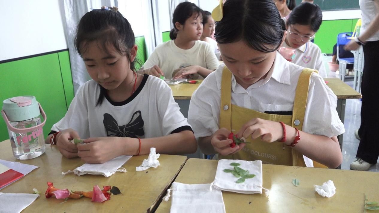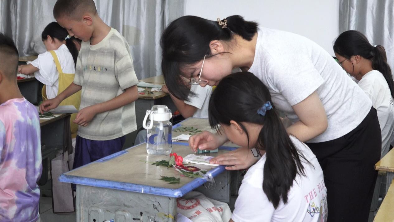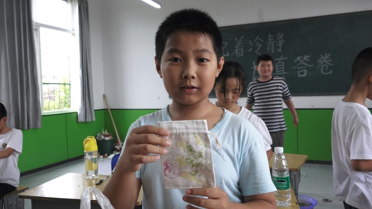 走进植物拓染的课堂,仿佛置身于一个充满生机与创意的绿色世界。支教队员引导孩子们走进校园角落,寻找那些形态各异、色彩斑斓的植物叶片。回到教室,孩子们小心翼翼地将叶片摆放在洁白的布料上,用小锤子轻轻敲击,随着叶片汁液的渗出,一幅幅精美的自然画卷在布料上逐渐呈现。每一片叶子都像是大自然的使者,将自己的独特印记留在了孩子们的作品中。在这个过程中,孩子们不仅感受到了大自然的神奇魅力,还锻炼了动手能力和审美能力,学会了用独特的视角去发现和创造美。