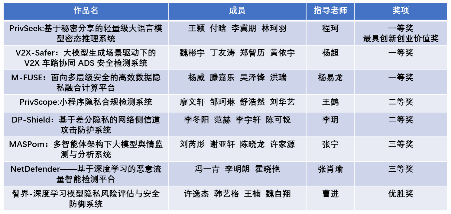 自2025年4月启动以来,公司网络安全竞赛基地共组织33支队伍参赛,选手们充分利用课余时间,通力合作,攻坚克难,完成了作品设计与报告撰写,最终8支队伍进入总决赛(每校最多8支)。同学们在暑假期间克服重重困难,经过8月14和15日两天激烈的比拼,公司员工最终荣获一等奖3项,二等奖2项,三等奖2项,优胜奖1项,最具创新创业价值奖1项。