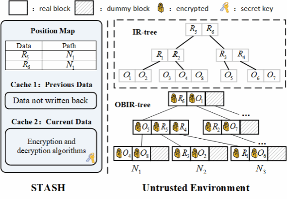 针对上述问题,本文提出了首个面向空间文本查询的不经意(可证明隐藏搜索模型、访问模型和卷模式)索引结构OBIR树,用以支持加密数据的不经意top-k空间文本查询。OBIR树是根据经典明文空间文本索引IR树和不经意数据结构PathORAM定制构造的紧凑空间文本索引,可以在不泄露任何有用信息的前提下实现亚线性搜索复杂度。此外,本文还提出了优化OBIR树查询延迟的扩展设计:(1)将OBIR树与硬件安全飞地(例如Intel SGX)相结合,将客户端-服务器交互降为单轮;(2)构建真实/虚拟块树(RDT)以降低飞地内不经意操作的计算成本。经过严格的测试评估,OBIR树在不泄露任何查询隐私的前提下支持百万级数据的十毫秒级查询,相比最先进的基线,查询速度提升了25-743倍。