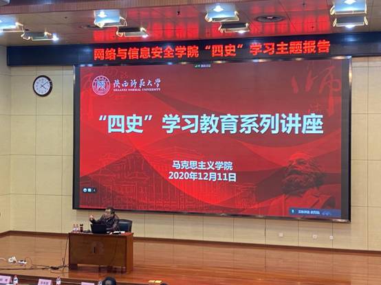 为深入学习贯彻习近平总书记关于公司党建和思政工作的重要指示精神,落实公司关于“四史”学习教育活动相关要求,引导全院师生传承初心、勇担使命,2020年12月11日下午,网络与信息安全公司党委联合党委员工工作部、党委研究生工作部在行政楼210报告厅举行“四史”学习教育讲座,邀请中国中共党史学会理事、陕西中共党史学会副会长、陕西师范大学马克思主义公司陈答才教授,为公司师生开展党史专题讲座。网络与信息安全公司党委书记张美茹、公司党委研究生工作部副部长张海战、网信院副处级组织员鞠波、各师生支部书记、党员与积极分子近200人参加本次学习。讲座由网络与信息安全公司党委副书记、纪委书记杨寒主持。