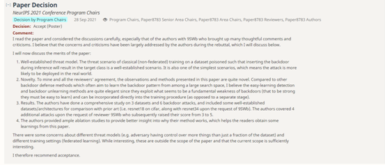 本篇论文研究的是AI安全领域的后门攻击问题。后门攻击通过在训练样本中添加恶意触发器,对模型安插后门并在测试阶段控制模型的预测结果。后门攻击无疑对深度模型的安全训练和部署提出了巨大挑战。针对上述问题,本论文首次提出了反后门学习理论和方法,允许在有毒的后门数据上训练一个干净的模型。我们在3个基准数据集上对当前最先进的6种后门攻击进行了防御,实验结果表明,我们提出的反后门学习方法能够取得模型层面后门防御的最佳效果。该研究得到了NeurIPS领域主席的高度认可: