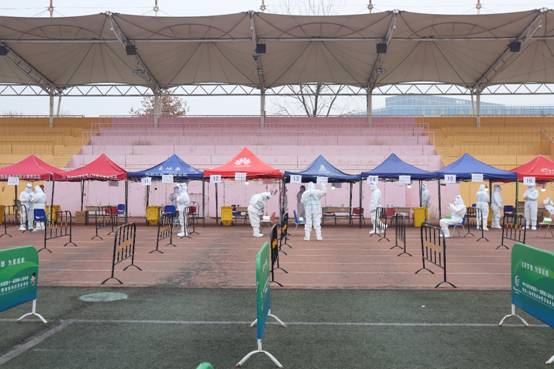 1月4日早晨8点,27名志愿者全部按时到达北操场指定地点进行准备工作。经过医护工作人员的细心培训和指导,志愿者很快进入状态,全副武装投入工作,与医护工作人员默契配合,开始了一天的核酸检测任务。