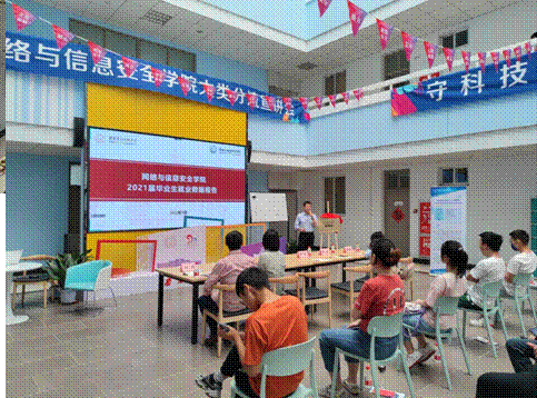网络与信息安全公司党委副书记杨寒向同学们介绍了网信院近年来的就业数据的相关情况,宣讲了部分优秀毕业生的事迹案例,并和同学们从“教育的目的,大学的本质”“珍惜时间,远离碎片”、“勤学善思,心无旁骛”三个维度展开交流,鼓励同学们过充实有意义的老员工活。